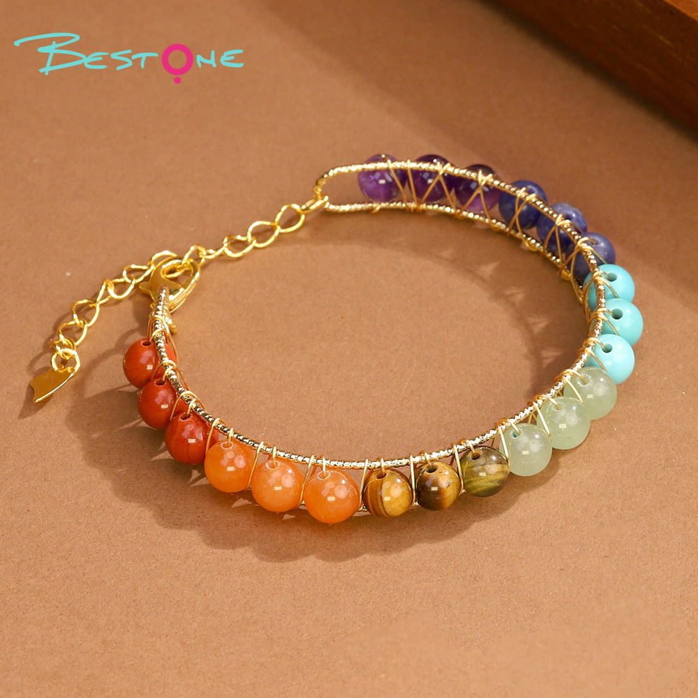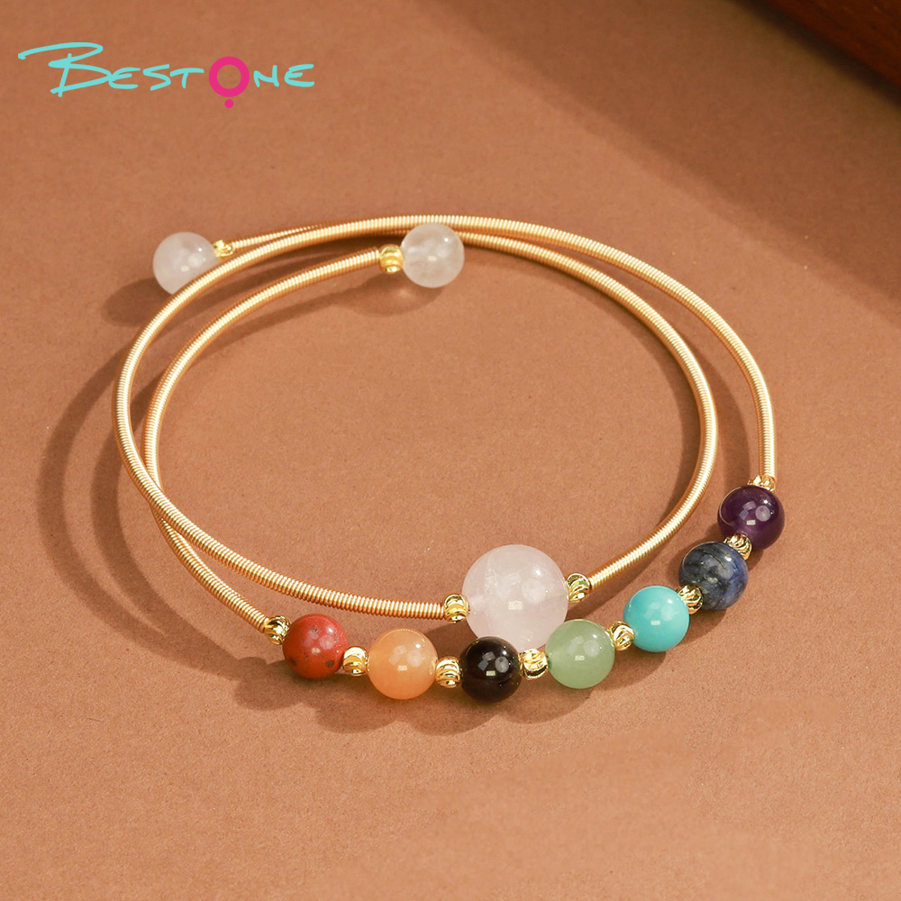 Коллекция включает браслеты из зелёного агата, малахита, аметиста, розового кварца, радужных кристаллов и лазурита. Каждый вариант сочетает натуральные камни с металлическими элементами, создавая изысканный баланс между природной энергией и современным стилем.