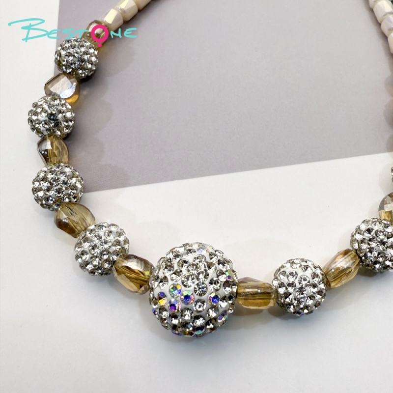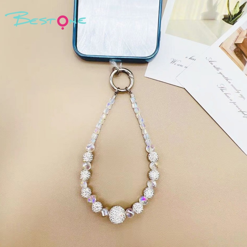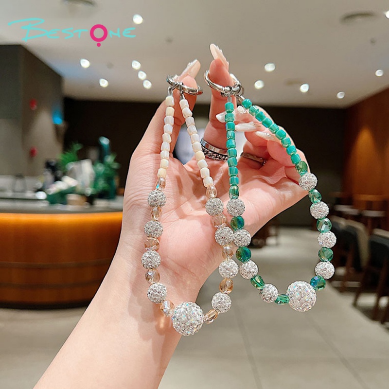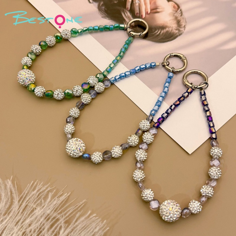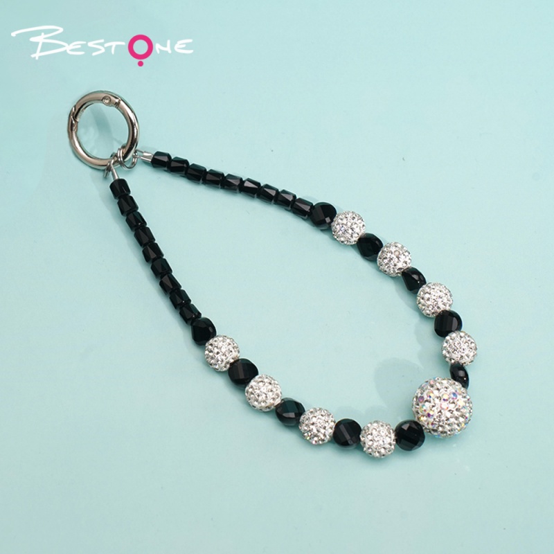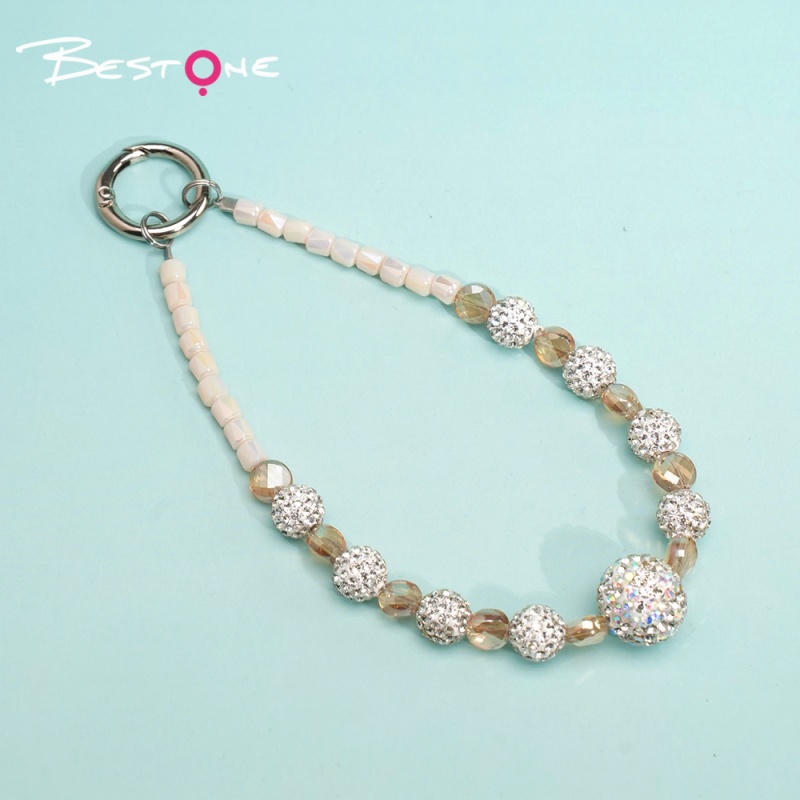 Этот короткий шнурок для телефона выполнен преимущественно из стекла с цветным напылением. Комбинация ограненных цилиндрических и приплюснутых бусин отличается прозрачностью и насыщенным блеском, а в сочетании с искрящимися круглыми стразами создается кристально-динамичный образ, полный современного стиля.