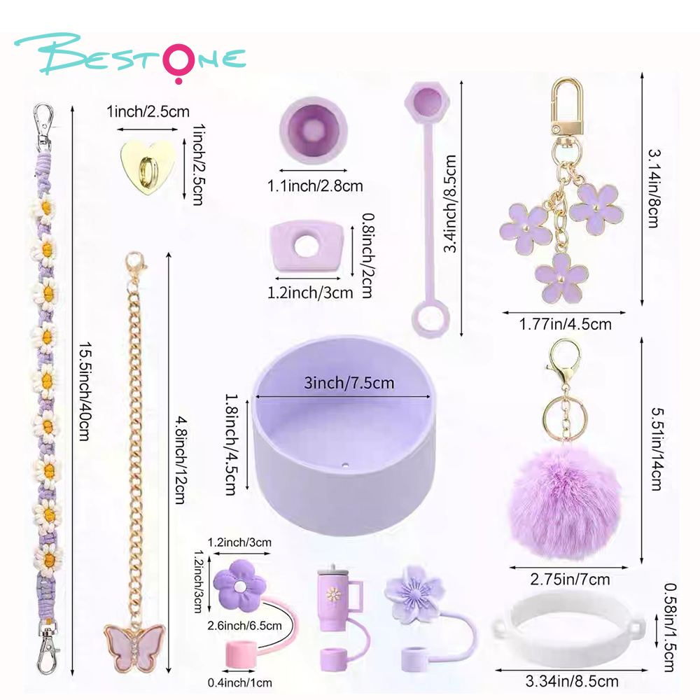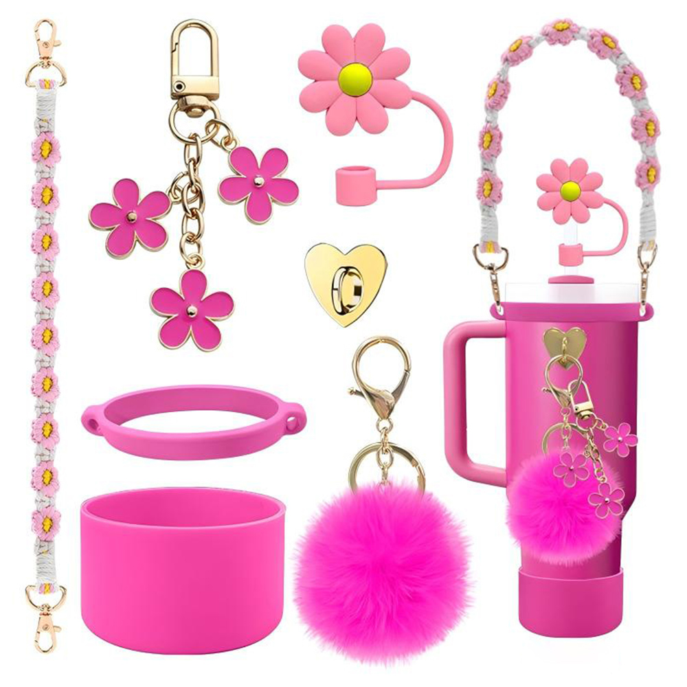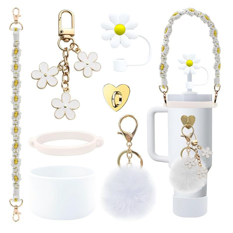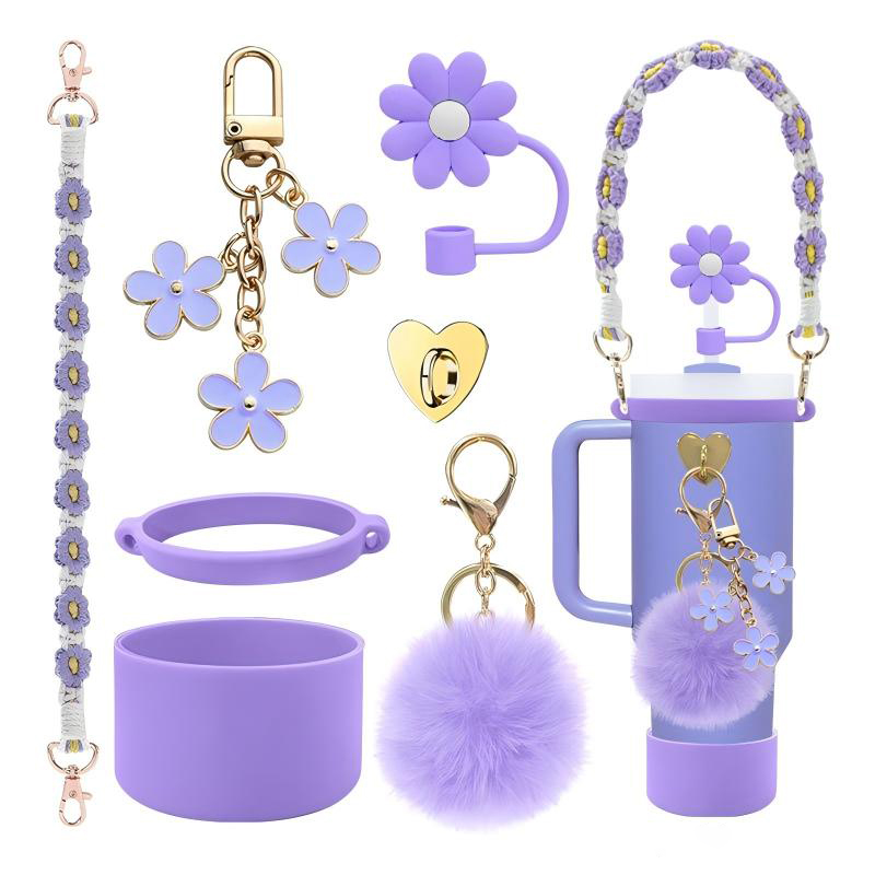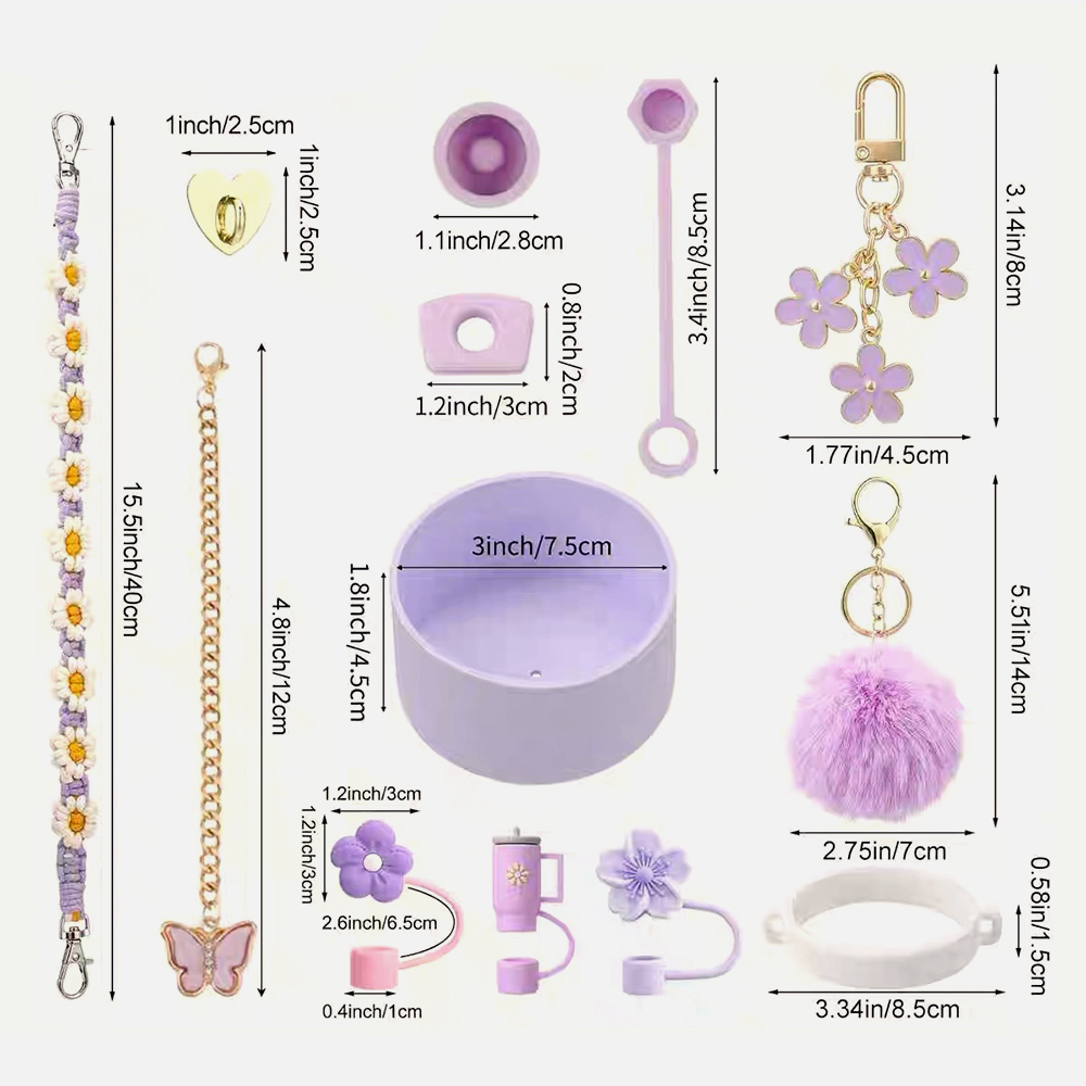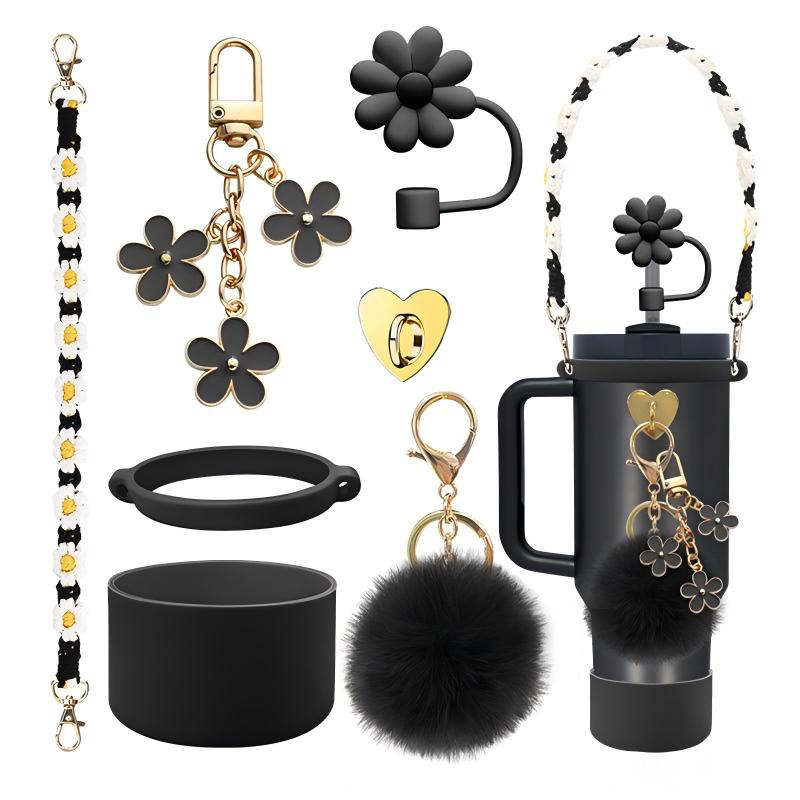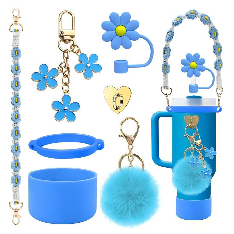 Этот набор из 7 предметов создан для украшения и защиты стаканов, бутылок и термокружек. В комплект входят силиконовая подставка, ремешок, пушистый брелок, цветочный аксессуар, силиконовое кольцо, колпачок для трубочки и металлический карабин-сердце.