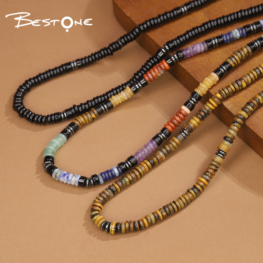 Серия ожерелий выполнена с использованием натуральных камней: черный обсидиан, тигровый глаз и разноцветные полудрагоценные камни. Сочетание цилиндрических бусин и серебристых вставок придает украшениям стильный и натуральный вид.
